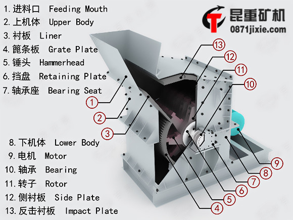 高效細碎機主要由上機體、襯板、篦條板、錘頭、擋盤、軸承、轉子、側襯板、反擊襯板等部件組成,高效細碎機為連續作業式設備。工作時,在電機的帶動下,轉子高速旋轉,細碎機物料進入第一破碎腔破碎,與轉子上的板錘撞擊破碎,然后進入第二細碎腔進行粉碎,最后在出料口排出。