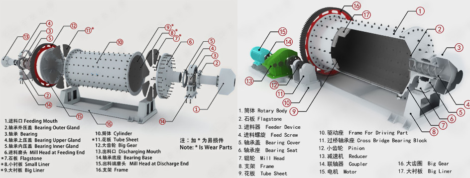 昆重礦機生產的濕式溢流型球磨機是由進料器、出料器、軸承座、端蓋、法蘭盤、筒體、大齒輪、傳動總成(減速機、小齒輪、聯軸器、電機)等部件組成。襯板采用13錳鋼耐磨料,具有耐磨及防腐特點。
