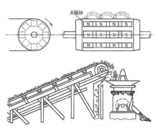 磁力滾筒又稱干磁輥,其結(jié)構(gòu)簡單,可直接安裝在皮帶輸送機(jī)的頭部,也可以叫拋廢機(jī)。它可用于物料除鐵,特別是用于磁鐵礦塊礦預(yù)選,俗稱減石頭機(jī)。