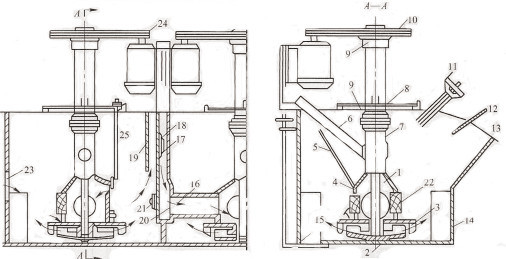 1、主軸;2、葉輪;3、蓋板;4、連接管;5、砂孔閘門絲桿;6、進氣管;7、空氣管;8、座板;9 、軸承;10、皮帶輪;11、溢流閘門手輪及絲桿:12、刮板;13、泡沫溢流唇;14、槽體;15、放砂閘門;16、給礦管(吸漿管);17、 溢流堰;18、溢流閘門;19、閘門殼(中間室外壁);20、砂孔;21、砂孔閘門;22、中礦返回孔;23、直流槽前溢流堰;24、電機及皮帶輪;25、循環(huán)孔調節(jié)桿。