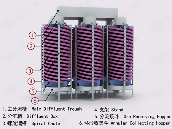 均勻的礦漿通過裝在螺旋溜槽首端的給礦槽緩慢地給到螺旋槽面上,進(jìn)行分選。螺旋溜槽的尾端裝有閥塊式產(chǎn)品截取槽,將分選的產(chǎn)品沿徑向按品位分成三種。用調(diào)節(jié)閥塊的位置來改變各產(chǎn)品的截取寬度,產(chǎn)品集聚斗將已截取的多頭礦流分別匯集導(dǎo)出。螺旋溜槽的橫截面,曲線的斜率變化特別適用于細(xì)微粒物料的選別。