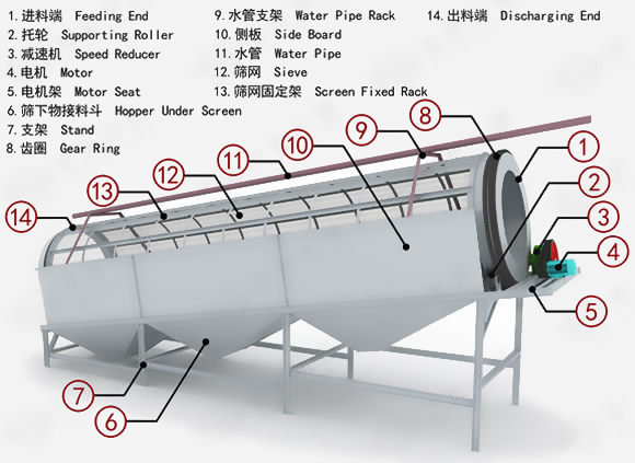 滾筒篩主要有電機(jī)、減速機(jī)、滾筒裝置、機(jī)架、密封蓋、進(jìn)出料口組成。筒體一般分三段,可視具體情況而定,篩孔由小到大排列,每一段上的篩孔孔徑相同。為了提高篩分效率,物料在滾筒篩內(nèi)移動(dòng)的速度不能太快,否則將造成篩分不充分、不徹底,因此滾筒篩一般都有嚴(yán)格規(guī)定的安裝傾角,通常來說角度為5°,在實(shí)際情況下,可根據(jù)需要進(jìn)行調(diào)整。滾筒段是通過螺母、螺釘與滾筒篩轉(zhuǎn)盤相連接的,因此滾筒段的安裝與拆卸比較方便。由于滾筒段與轉(zhuǎn)盤相連,當(dāng)轉(zhuǎn)盤在驅(qū)動(dòng)裝置的驅(qū)動(dòng)下發(fā)生轉(zhuǎn)動(dòng)時(shí),滾筒段也跟著一起轉(zhuǎn)動(dòng)。